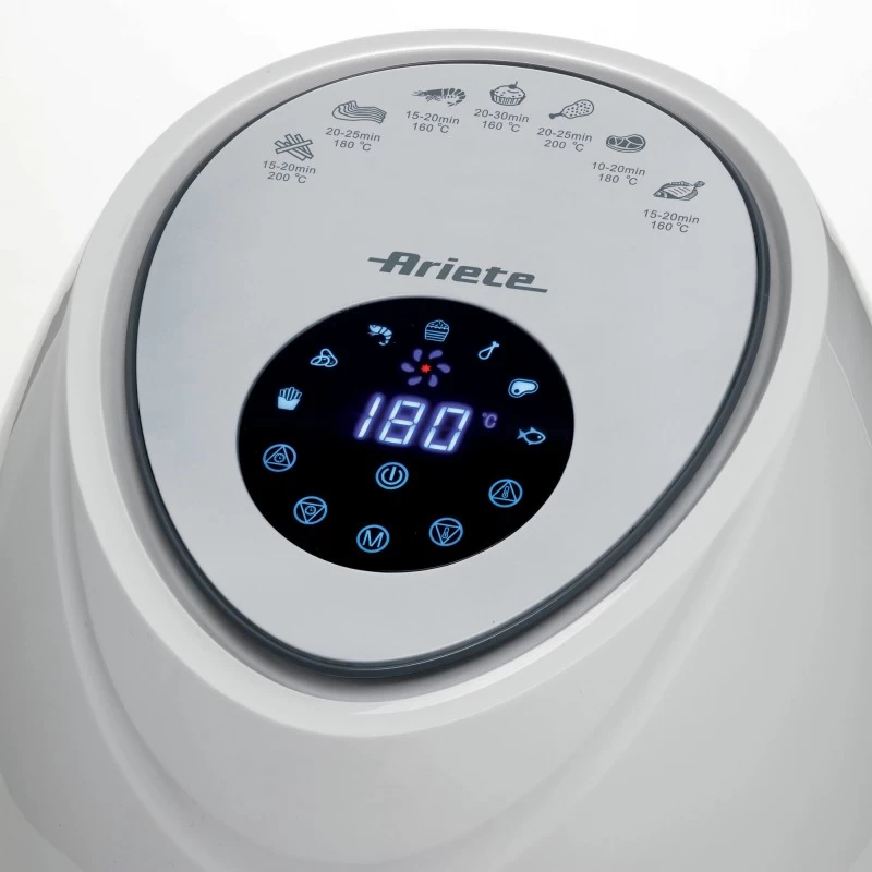 Ariete 4618/03. Tipo di prodotto: Friggitrice ad aria calda, Capacità: 5,5 L, Capacità friggitrice: 2,5 kg. Tipo di costruzione: Singolo, Colore del prodotto: Acciaio inossidabile, Bianco, Tipo di controllo: Touch. Tipo di display: LCD. Potenza: 1800 W. Larghezza: 225 mm, Profondità: 390 mm, Altezza: 375 mm