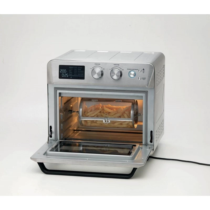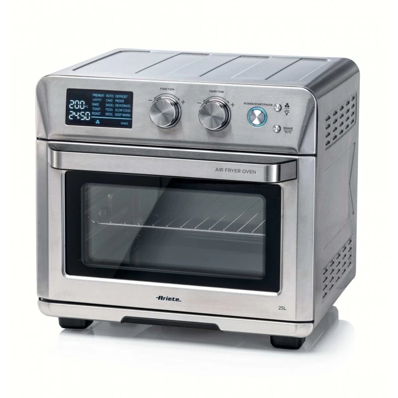 Dal grande display digitale puoi regolare tempi di cottura, programmi, temperatura e timer. Airy Fryer 25L è multifunzione: Preriscaldamento, Airfry, Toast, Arrosto, Girarrosto, Dolci, Bagel, Pizza, Grill, Scongelamento, Lievitazione, Essicazione, Slow cook, Riscaldamento. Airy Fryer 25L presenta 2 plus: il set girarrosto e il cestello rotante.