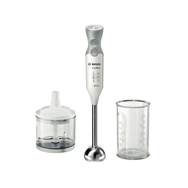 Bosch ErgoMixx MSM66120. Tipo di controllo della velocità: A gradini, Tipo di controllo: Pulsanti, Manopola. Tipo: Frullatore ad immersione, Colore del prodotto: Grigio, Bianco, Lunghezza cavo: 1,4 m. Materiale della ciotola di miscelazione: Plastica, Materiale della scocca: Plastica, Materiale manico: Plastica. Potenza: 600 W, Alimentazione: AC, Tensione di ingresso AC: 220 – 240 V. Larghezza: 55 mm, Profondità: 62 mm, Altezza: 393 mm