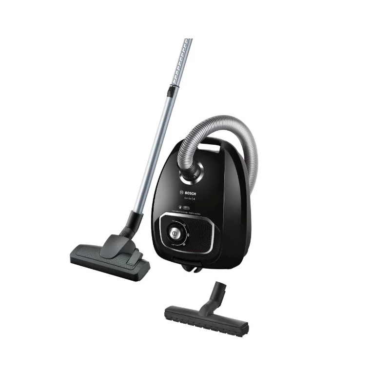 Bosch Serie 4 . Massima potenza in entrata: 600 W. Tipo: A cilindro, Tipo di pulizia: Secco, Tipo di contenitore della polvere: Sacchetto per la polvere. Sistema di filtraggio dell’aspirapolvere: Filtro igienico, Metodo di separazione dello sporco: Filtro, Emissione acustica: 77 dB. Colore del prodotto: Nero