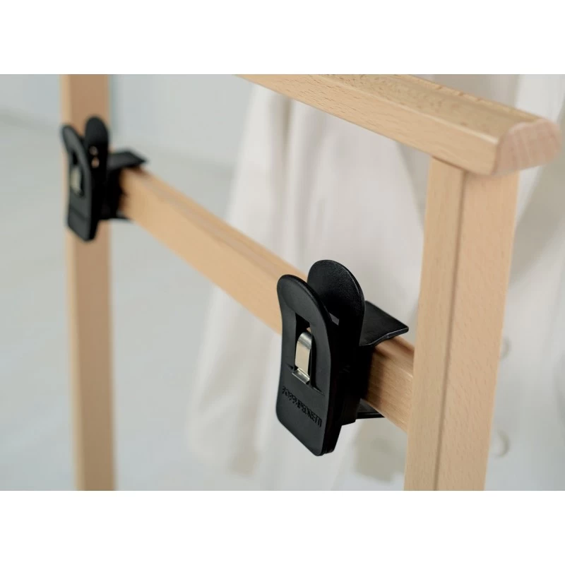 La struttura in legno massiccio di faggio ha una spalla per giacche e camicie, una staffa porta pantaloni con pinze regolabili per appendere le gonne e una base porta scarpe. Si sposta facilmente grazie alle ruote piroettanti antigraffio e ha anche una vaschetta porta oggetti.
