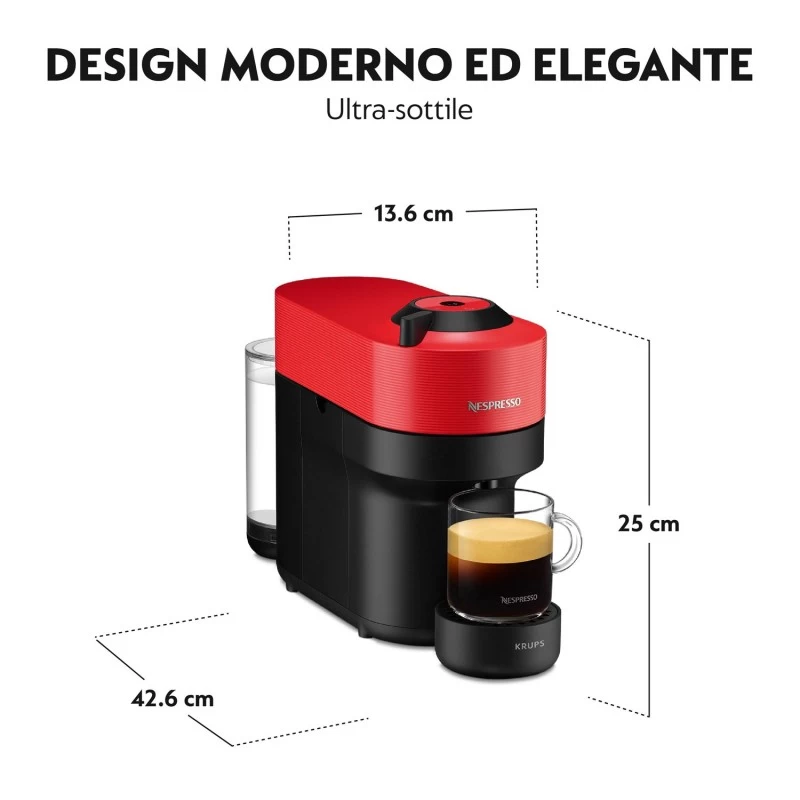 Krups Vertuo Pop Nespresso by XN9205. Tipo di prodotto: Macchina per caffè a capsule, Tipologia macchina del caffé: Automatica, Capacità tanica acqua: 0,56 L, Tipologia di caffè utilizzato: Capsule caffè, Vaschetta per caffè preparato: Tazza, Capacità in tazze: 1 tazze. Potenza: 1500 W. Colore del prodotto: Nero, Rosso