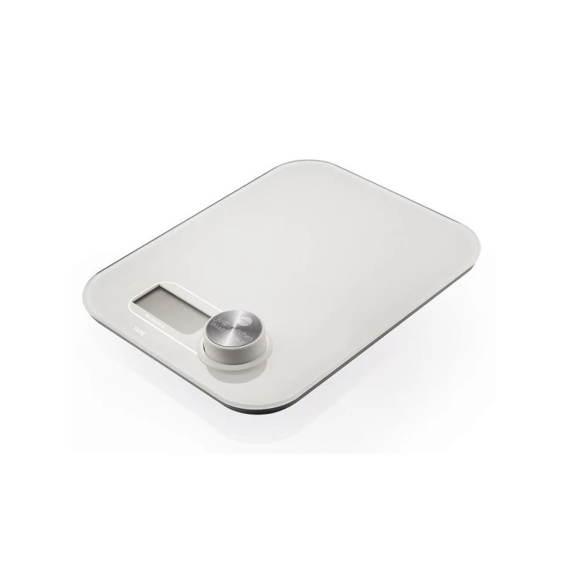 Elegante bilancia per alimenti. L’innovativo funzionamento SENZA PILE, garantisce un utilizzo di più di 50.000 pesate. Ricaricabile manualmente.