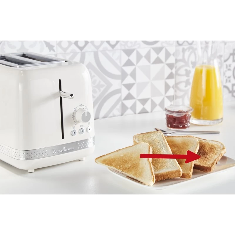 Esprimi il tuo stile in cucina con una gamma che completerà il tuo piano di lavoro. Le linee essenziali e il design innovativo del tostapane Soleil illumineranno la tua cucina. Con 7 livelli di doratura, questo tostapane offre fette di pane tostate alla perfezione per tutti i gusti. I due scomparti a larghezza variabile sono ideali per fette di pane spesse e sottili, mentre tre funzioni con indicatori luminosi offrono una maggiore facilità d’uso: Arresto, per interrompere immediatamente il ciclo di tostatura; Scongelamento, per tostare il pane congelato; e Riscaldamento, per riscaldare il pane precedentemente tostato. Il tutto è completato da una leva di sollevamento extra, per rimuovere facilmente le fette di pane più piccole, da un pratico vassoio raccoglibriciole, per una pulizia facile, e da una potenza di 850 W. Con il tostapane a 2 scomparti Moulinex Soleil avrai stile anche in cucina!