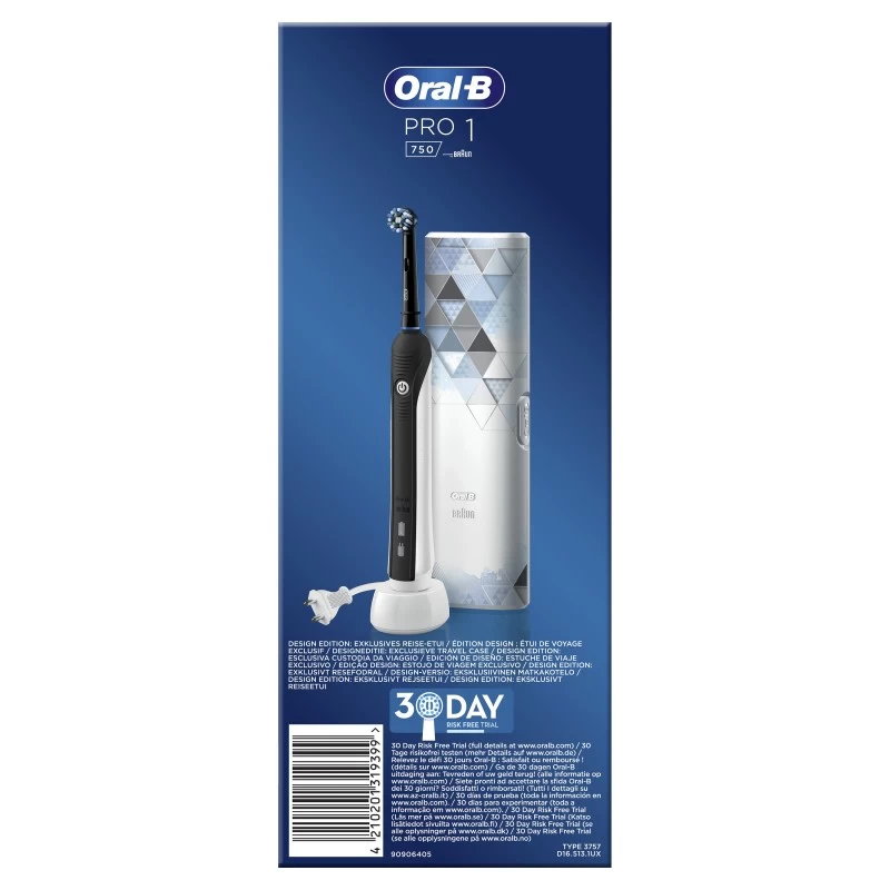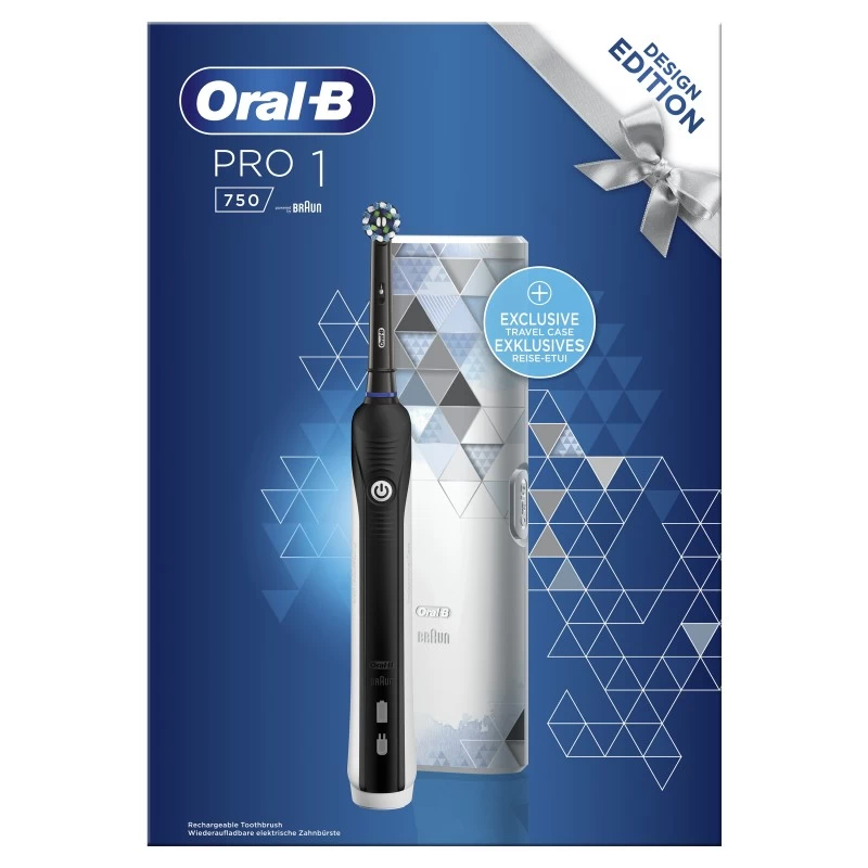 Oral-B PRO 1-750 Spazzolino Elettrico Ricaricabile Di Braun, 1 Testina, 1 Custodia Da Viaggio In Regalo. Utilizzo: Adulto, Tipo di spazzolino da denti: Spazzolino rotante-oscillante, Colore del prodotto: Nero, Bianco. Alimentazione: Batteria, Tipo batteria: Batteria integrata. Peso: 325,25 g, Larghezza imballo: 100 mm, Profondità imballo: 178 mm. Numero di spazzolini inclusi: 1 pz, Numero di testine incluse: 1 pz. Quantità per pacco: 1 pz, Larghezza scatola principale: 313 mm, Lunghezza del cartone principale: 364 mm