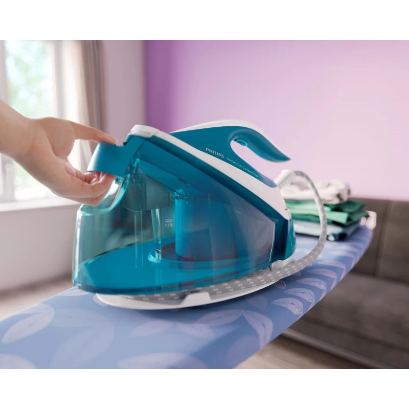 Philips PerfectCare Compact Plus GC7923/20 Ferro generatore vapore, fino a 6,5 bar di pressione pompa. Potenza ferro: 2400 W, Emissione concentrata vapore: 440 g/min, Materiale piastra: SteamGlide. Tensione di ingresso AC: 220 – 240 V, Risparmio energetico: 35%. Lunghezza cavo: 1,65 m, Lunghezza tubo: 1,6 m, Sistema di fissaggio del filo: Fissaggio con gancio e anello. Larghezza: 200 mm, Profondità: 371 mm, Altezza: 233 mm. Potenza: 2400 W