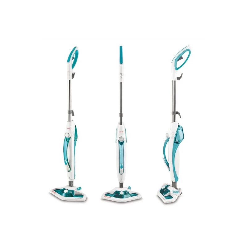 Polti SV450 Double. Tipo: Pulitore a vapore verticale, Capacità: 0,3 L, Colore del prodotto: Acciaio inossidabile, Turchese, Bianco. Potenza: 1500 W. Superficie di pulizia: Superfici rigide, Piastrelle, Tappezzeria, Legno, Tempo di riscaldamento: 15 s. Indicatori LED: Pronto. Peso: 2,4 kg, Larghezza: 20 mm, Profondità: 32 mm