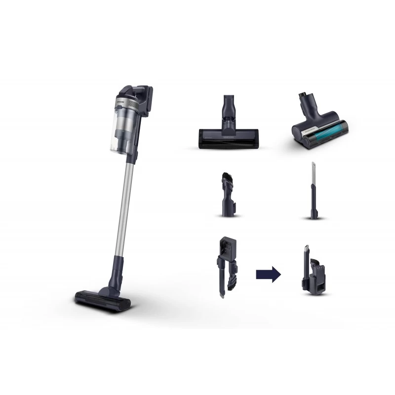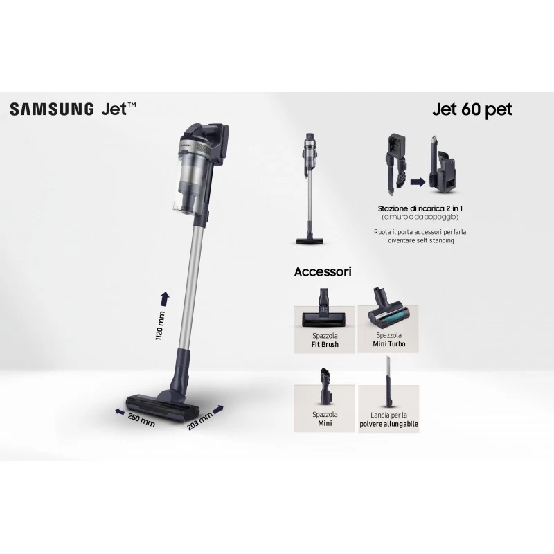 Samsung Aspirapolvere senza filo Jet™ 60 pet 150W VS15A6032R5/ET. Tipo di pulizia: Secco, Metodo di separazione dello sporco: Multiciclonico, Emissione acustica: 86 dB. Tipo di contenitore della polvere: Senza sacchetto, Colore del prodotto: Nero, Argento, Capacità aspirazione solidi: 0,8 L. Alimentazione: Batteria, Durata di funzionamento: 40 min, Voltaggio della batteria: 21,6 V. Peso: 2,3 kg, Larghezza: 250 mm, Profondità: 203 mm. Larghezza imballo: 260 mm, Profondità imballo: 209 mm, Altezza imballo: 757 mm
